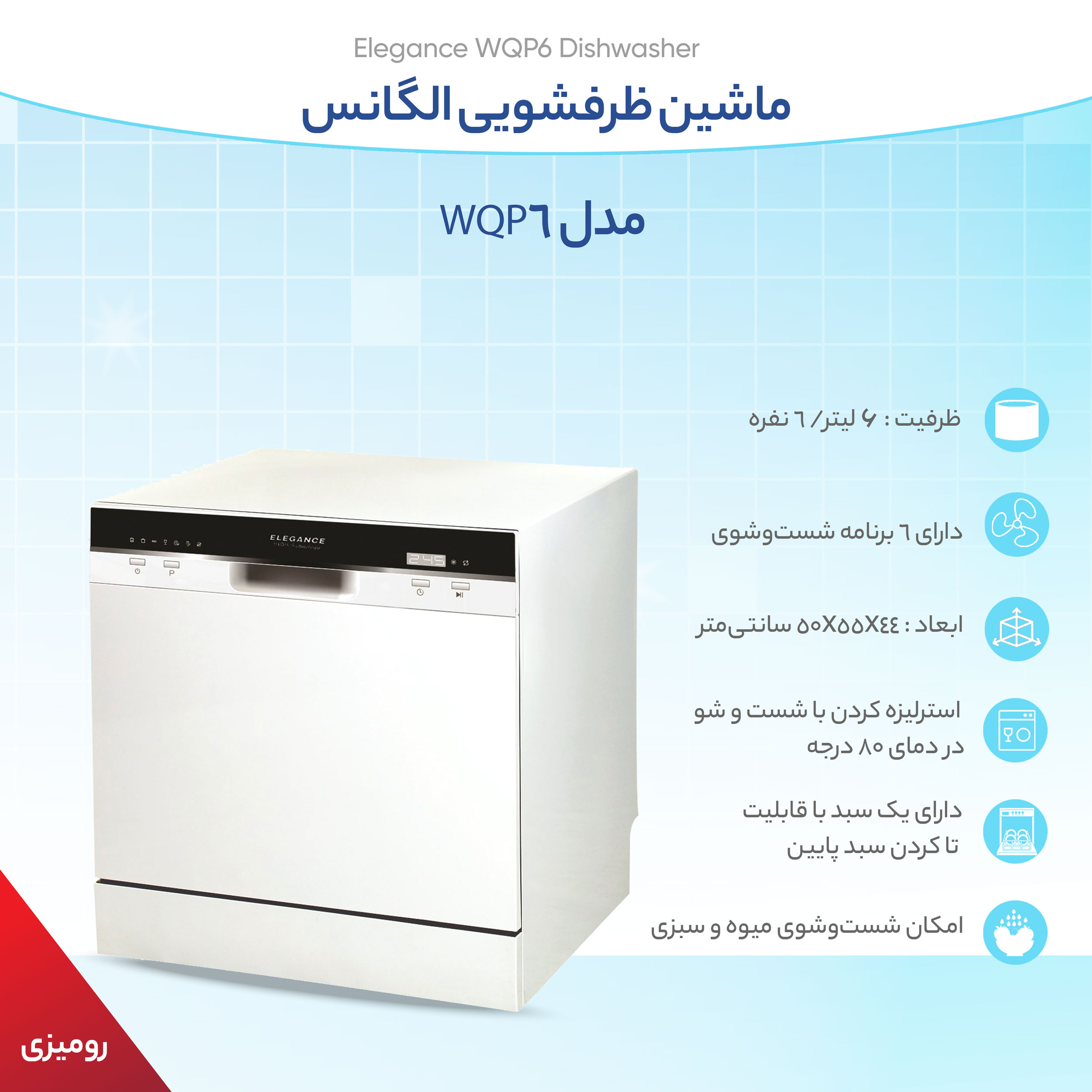 ماشین ظرفشویی الگانس مدل WQP6 دستگاهی بسیار کاربردی بوده که با طراحی و کیفیت بالای ساخت همراه شده است. این ماشین ظرفشویی رومیزی ظرفیتی دارد که میتواند بشقاب و لیوان استفاده شده توسط 6 نفر را در خود جای دهد و با کیفیت بالا بشوید. ابعاد دستگاه امکان استفاده آن روی میز یا کانتر کابینت را میدهد. ماشینظرفشویی مدل WQP6 محصولی با کیفیت از برند معتبر الگانس است. است الگانس برندی معتبر است که کالاهای باکیفیتی را تولید و در سرتاسر جهان توزیع میکند. برند معتبر الگانس لوازم خود را به سراسر دنیا عرضه میکند و کیفیت بالای این محصولات موجب افزایش تقضا شده است. این محصول برای استفاده یک خانواده 6 نفره کافی است . گروه آن رومیزی است و به آسانی میتوانید آن را در آشپزخانهتان قرار دهید. این مدل امکان شستوشوی ظروف در حجم زیاد را دارد و برای یک خانواده 6 نفره دارد.این مدل از کیفیت بالایی، مانند باقی محصولات الگانس برخوردار است. یکی از دغدغههای خریداران ماشینهای ظرفشویی مبله پر کردن تمامی ظرفیت آن است. با استفاده از این مدل دیگر این دغدغه را نخواهید داشت. استفاده از ماشین ظرفشویی در مهمانیها کمک شایانی خواهد بود و به میزبان کمک میکند تا زمان بیشتری با میهمانان باشد و یا پس از میهمانی زحمت شستن ظروف را نکشد. این مدل در ابعاد گنجایش، پهنا 440 میلی متر، عمق 500 میلی متر و ارتفاع 550 میلی متر طراحی شده است. این مدل دارای محفظه داخلی استیل است. ماشینهای ظرفشویی در مصرف آب و برق نیز صرفهجویی میکنند. رده مصرف انرژی این محصول A+ است. با استفاده از این محصول علاوه بر راحتی در شستشوی ظروف، آب کمی مصرف میشود. این ماشین ظرفشویی با بهرهگیری از 6 برنامهشستوشوی از پیش تعیینشده قطعا رضایت مصرفکننده را تامین میکند. شما با توجه به میزان استفاده، سرعت مدنظر و تعداد ظروف یکی از این 6 حالت را انتخاب میکنید. این امکان به شما قدرت انتخاب بسیاری میدهد و شما با توجه به خواستهتان نحوه شستشو و کار ماشینظرفشویی الگانس مدل WQP6 را مشخص میکنید. یکی از ویژگیهای این مدل قابلیت اضافه کردن ظروف جا مانده است. WQP6 دارای امکانات ویژهای مانند نمایشگر میزان کسری نمک و مایع است که با درنظر گرفتن کیفیت ساخت و این امکانات میتوان این محصول را از شاخصترین محصولات این گروه کالایی دانست.